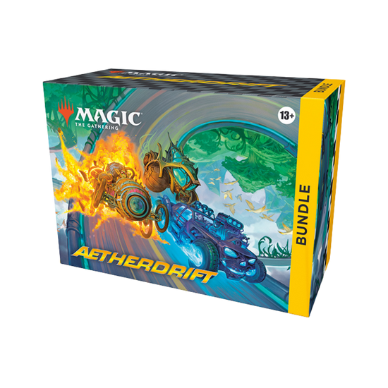 Put the pedal to the metal and feel the adrenaline with a box full of Aetherdrift cards and exclusive accessories. This Bundle contains 9 Aetherdrift Play Boosters, plus 1 Traditional Foil card with Bundle-exclusive alternate-art, 20 Traditional Foil and 20 nonfoil Land cards, 1 oversized Spindown life counter, 1 card storage box, and 2 reference cards. Each Play Booster contains 14 Magic: The Gathering cards, including 1–4 cards of rarity Rare or higher and at least 1 Traditional Foil card.
