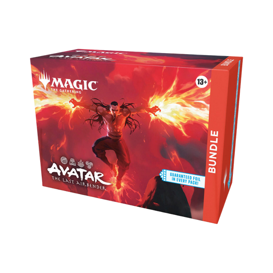 Wield the power of the elements as Avatar: The Last Airbender teams up with Magic: The Gathering! This Bundle includes 9 Magic: The Gathering | Avatar: The Last Airbender Play Boosters (each containing 14 cards), 1 Traditional Foil promo card with Bundle-exclusive alternate art, 15 Traditional Foil Land cards (5 with full art), 15 nonfoil Basic Land cards (5 with full art), 1 oversized Spindown life counter, 1 Magic: The Gathering | Avatar: The Last Airbender card storage box, and 2 reference cards.
