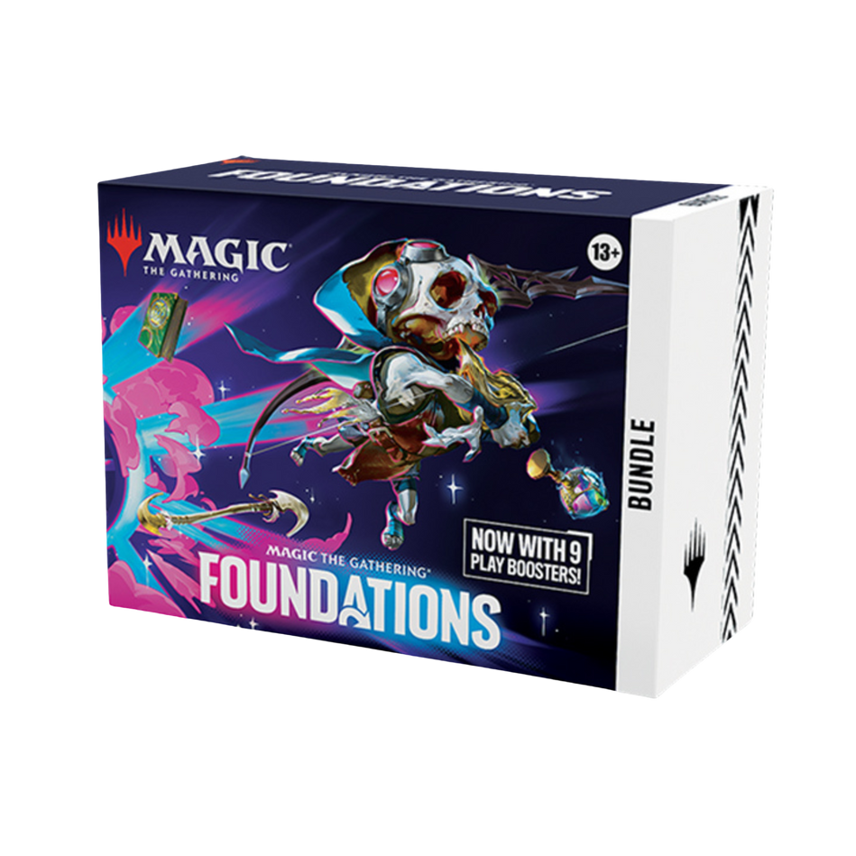 The best time to play your first Magic game is now. Dive into Foundations to create and share your quintessential Magic: The Gathering experience playing with and collecting cards selected to give every player the advantage. In this Bundle you’ll find 9 Foundations Play Boosters (each containing 14 cards), plus 1 Traditional Foil card with Bundle-exclusive alternate art, 20 Traditional Foil Basic Land cards (10 with Full Art), 20 nonfoil Lands (10 with Full Art), 1 oversized Spindown life counter, 1 Foundations card storage box, and 2 reference cards.