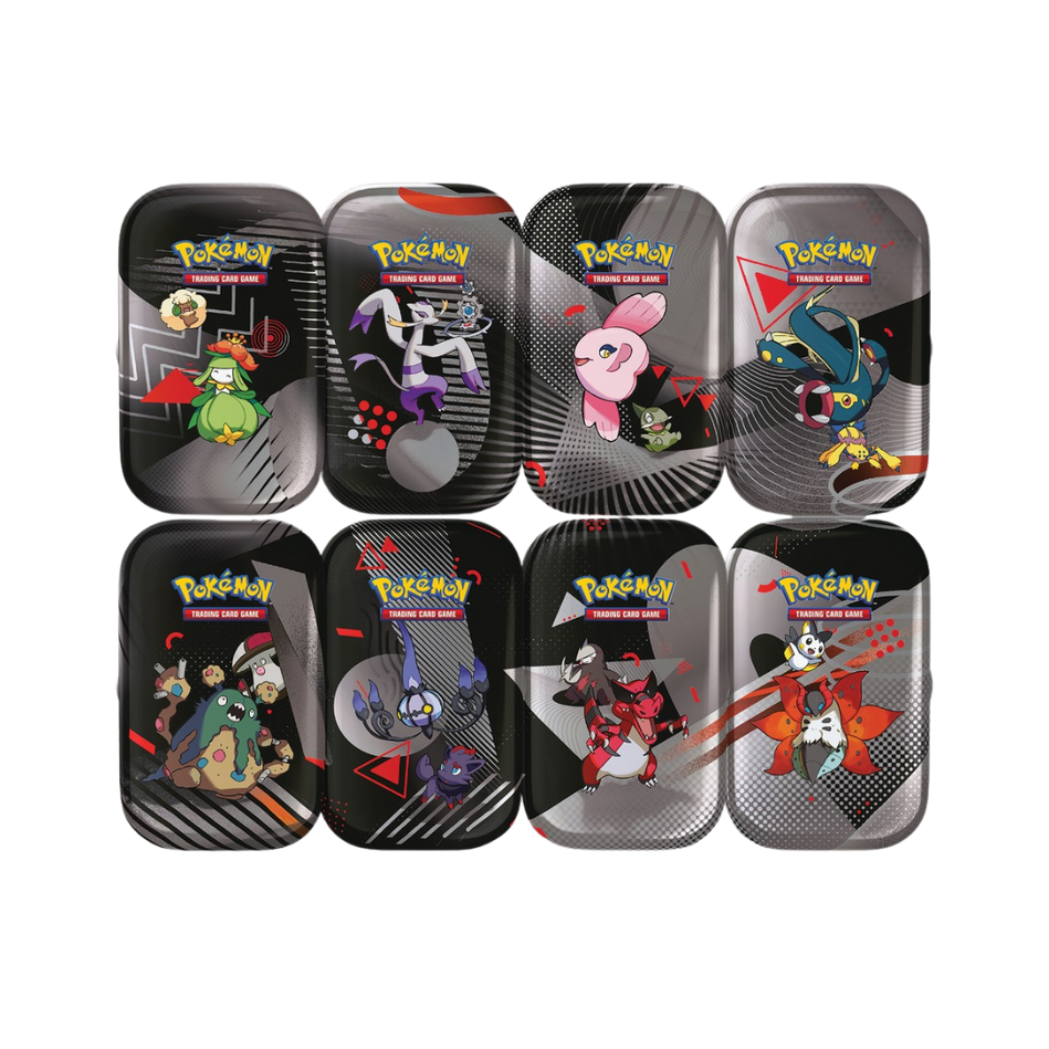 Pokemon Favorites in the Palm of Your Hand! In this Pokemon TCG: Unova Mini Tin, you'll find: 1 Pokemon TCG: Scarlet & Violet Black Bolt booster pack, 1 Pokemon TCG: Scarlet & Violet White Flare booster pack, 1 of 8 sticker cards showing the art from this Mini Tin, and A Pokemon art card showing the art from this Mini Tin- you can collect and combine all 8!