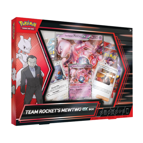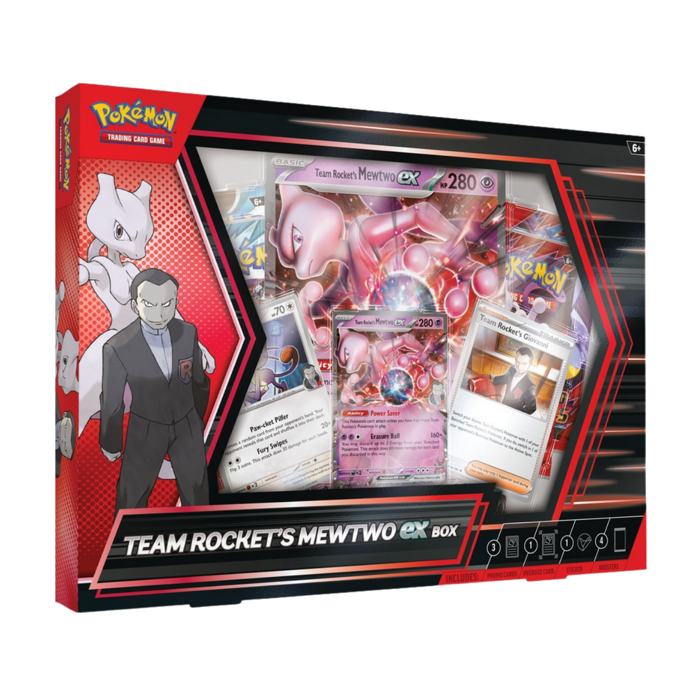 Giovanni & Mewtwo Join Forces to Fight! In pursuit of ultimate power and world domination, Giovanni and Team Rocket are unleashing one terrifyingly strong Pokemon in battle! When Team Rocket's Mewtwo ex has backup from other Team Rocket's Pokemon, its Erasure Ball attack can do up to 280 damage in one massive blow. In this box, you'll find this powerful Pokemon ex as a foil promo card, along with Team Rocket's Meowth and Team Rocket's Giovanni, plus a photo sticker and handful of booster packs. The Pokemon TCG: Team Rocket's Mewtwo ex Box includes: 1 foil promo card featuring Team Rocket's Mewtwo ex, 2 foil cards featuring Team Rocket's Meowth and Team Rocket's Giovanni 1 oversize foil card featuring Team Rocket's Mewtwo ex, 1 photo sticker, 4 Pokemon TCG booster packs, and A code card for Pokemon TCG Live.